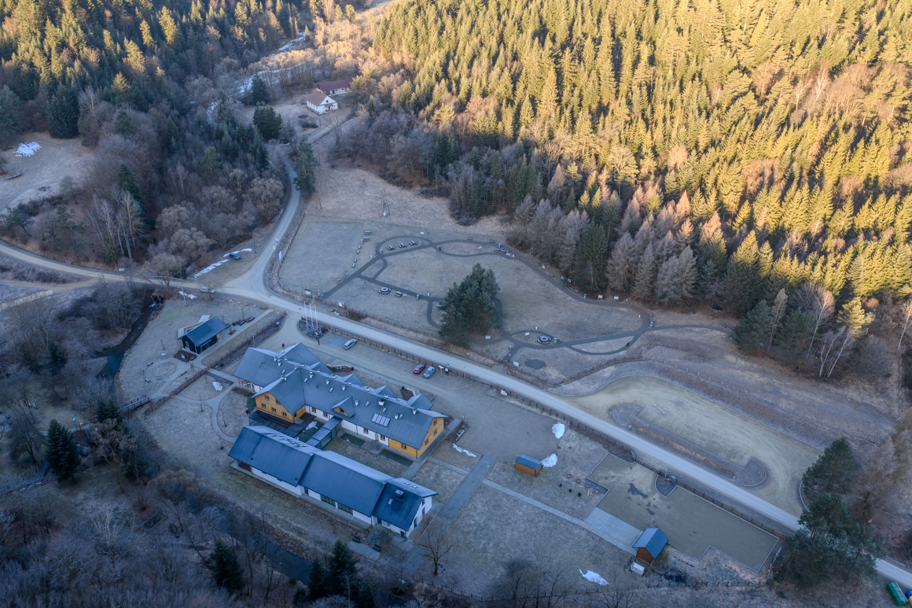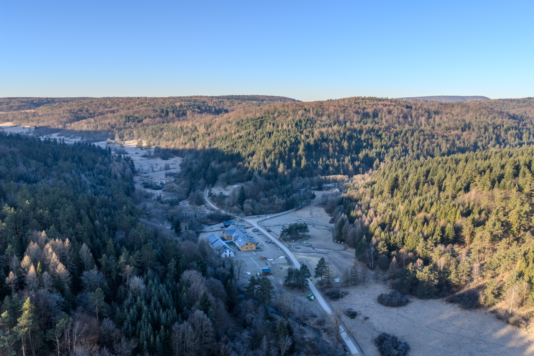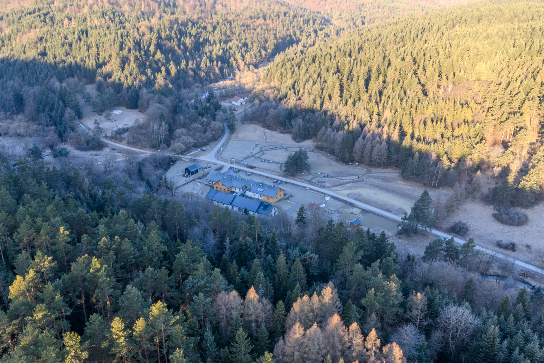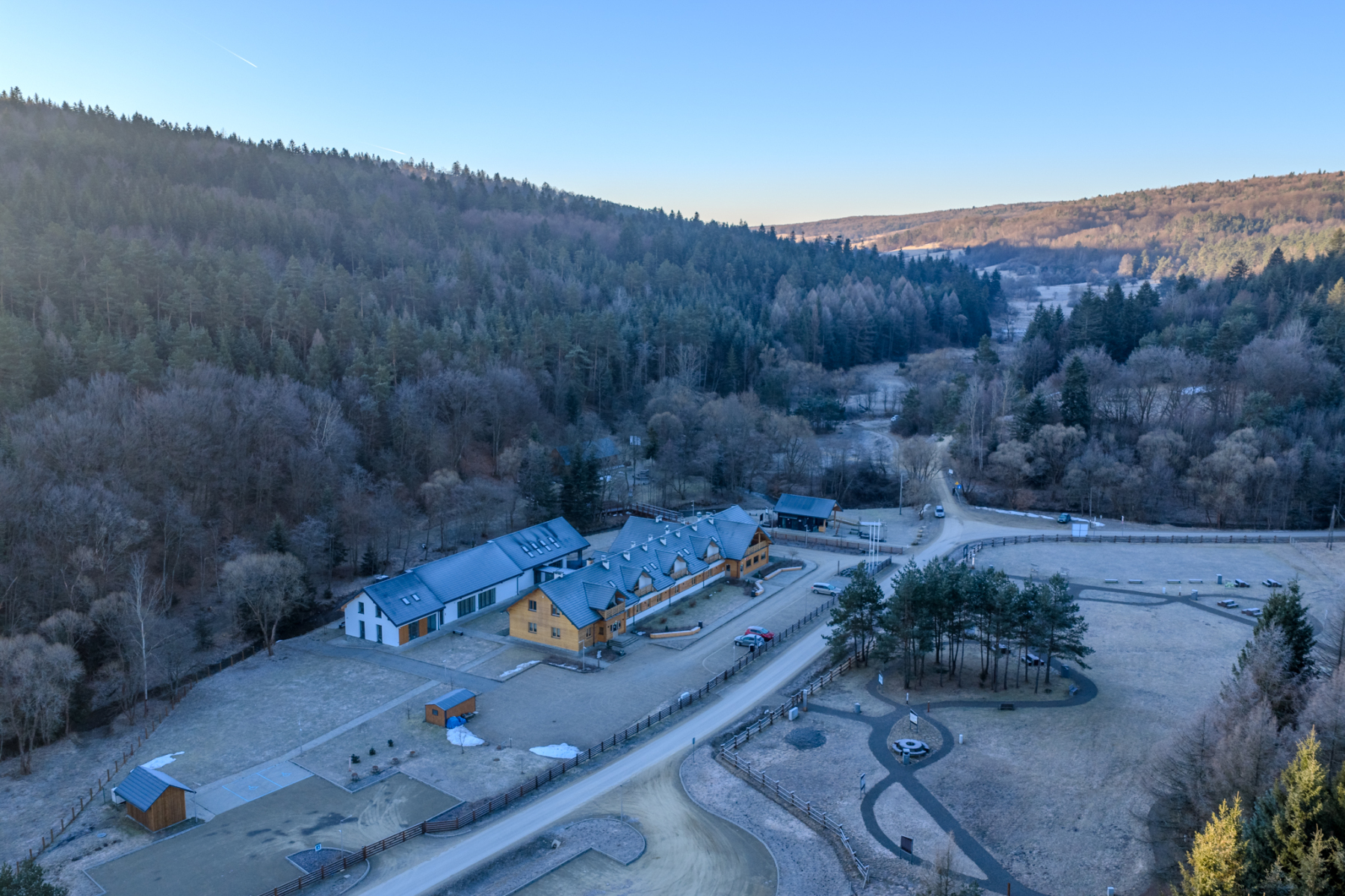 Dolina ciągnie się wzdłuż niewielkiej tutaj Wisłoki, otoczona z trzech stron gęstym lasem. Z góry widać wyraźnie, jak zabudowania ośrodka wtapiają się w krajobraz: jasne dachy i drewniane elewacje nie konkurują z zielenią, tylko ją podkreślają.