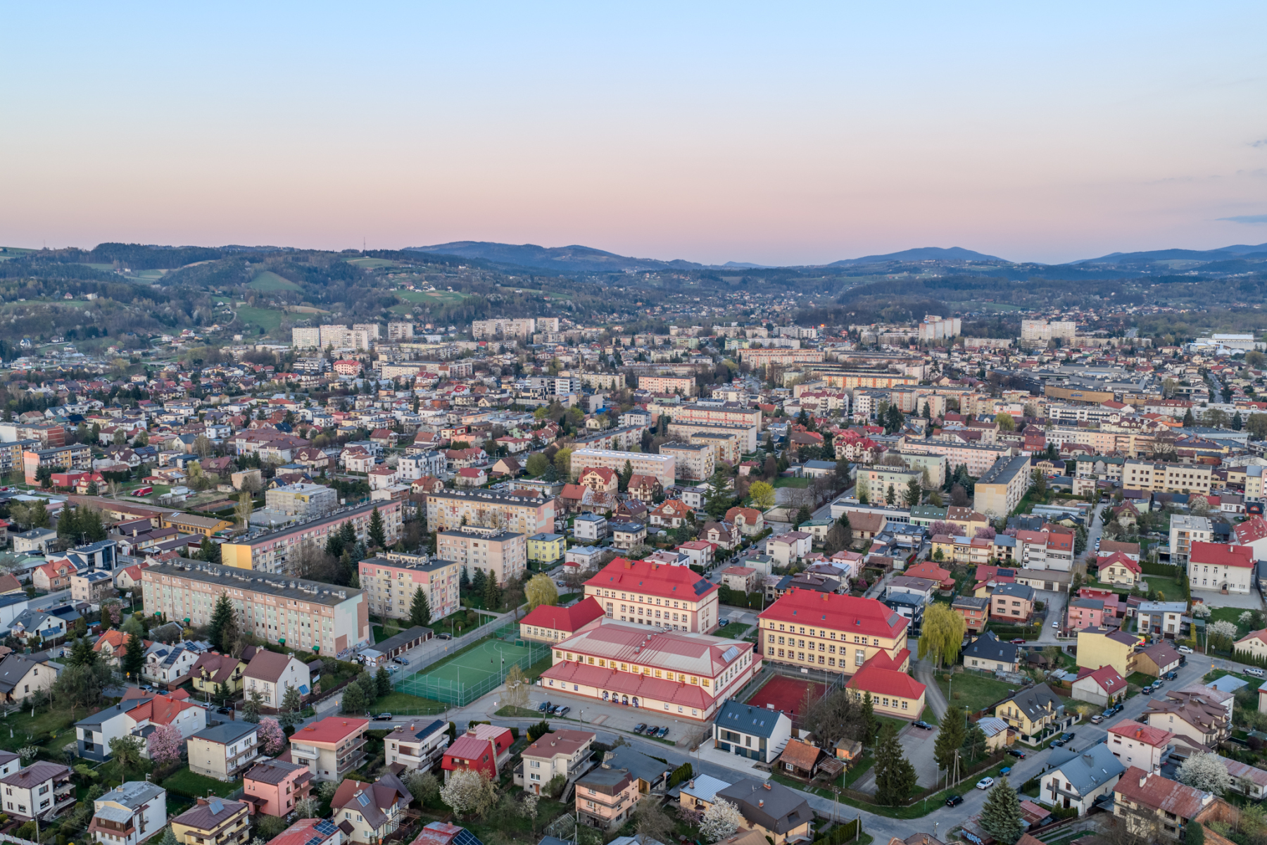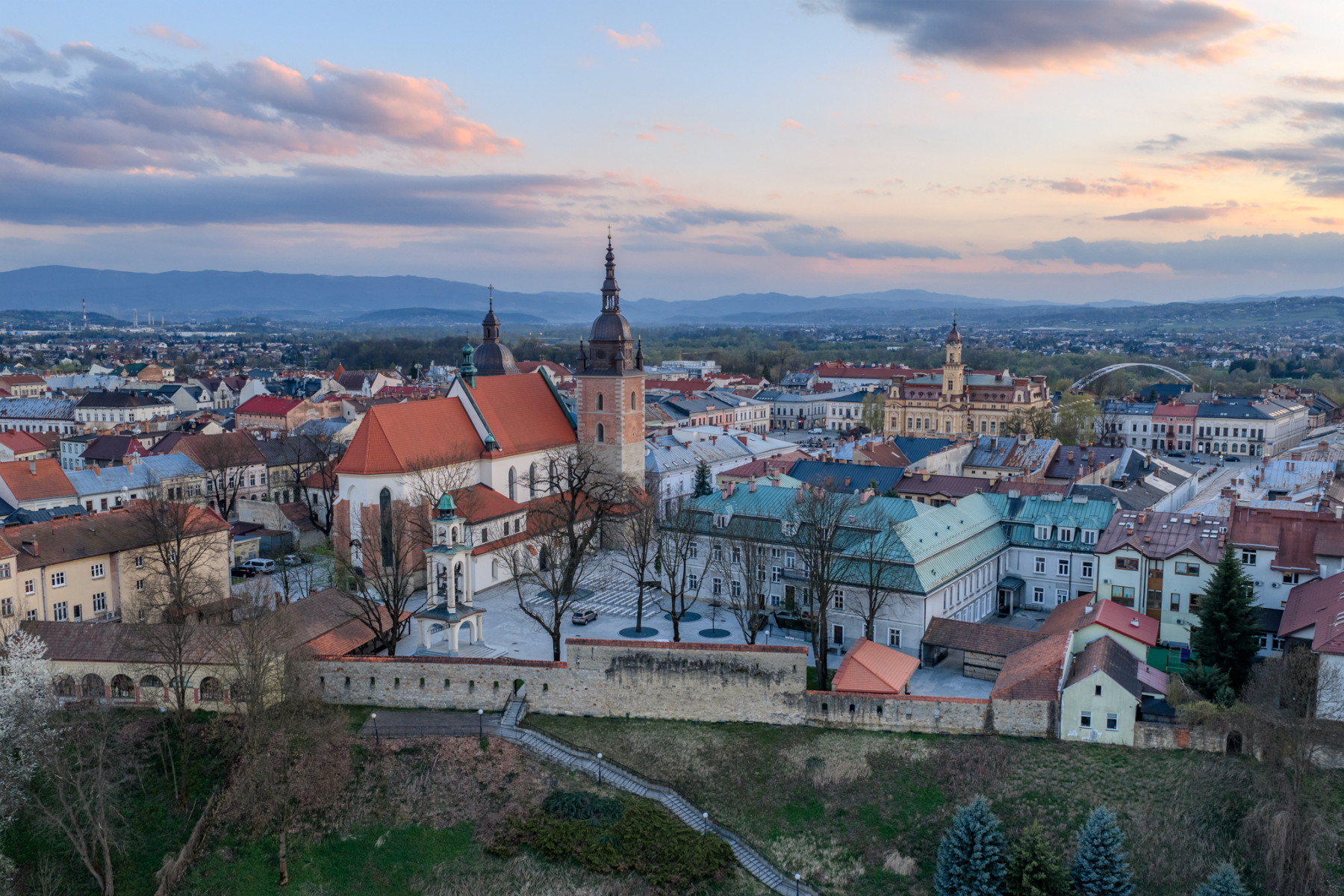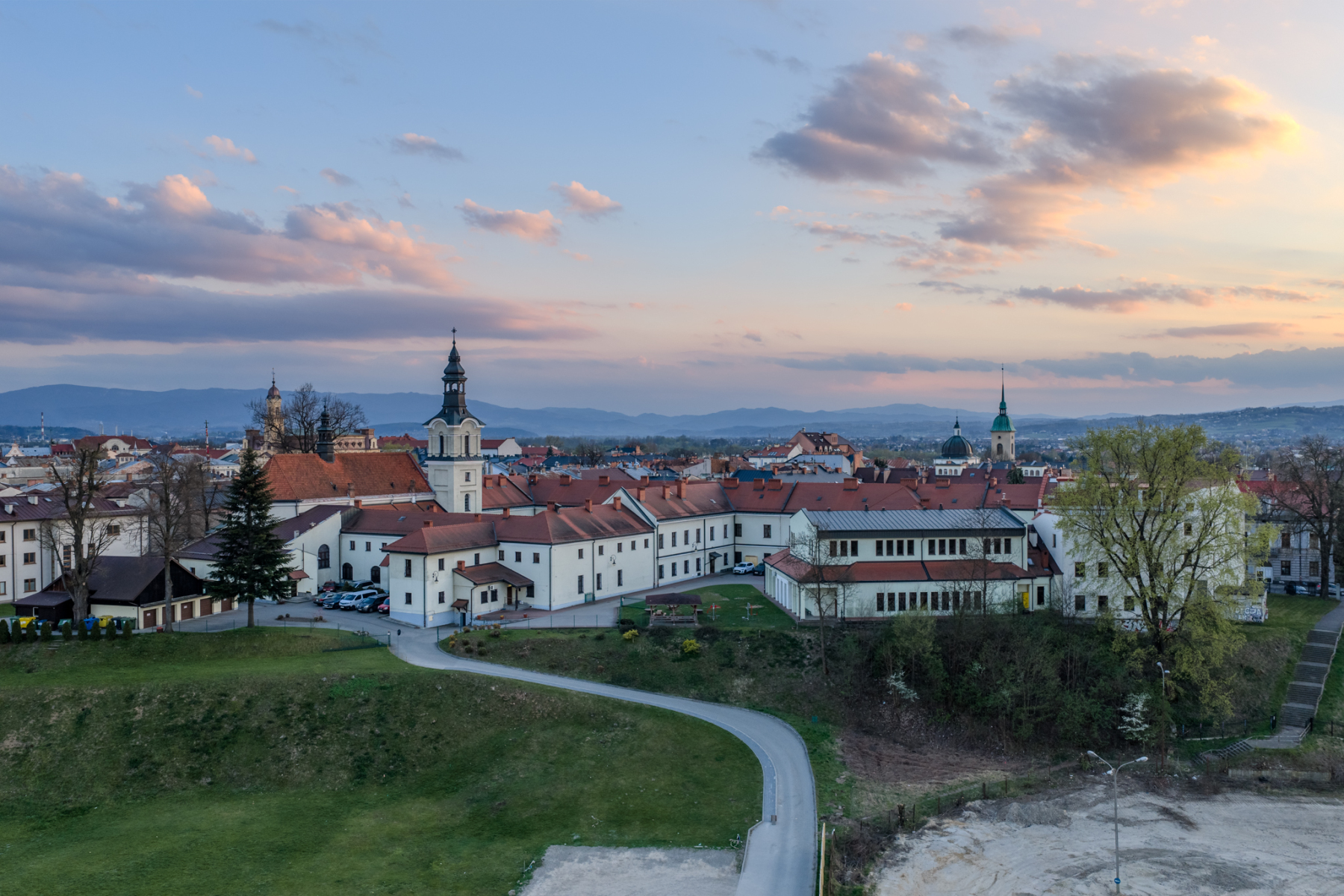 Wiosna w Nowym Sączu ma w sobie coś wyjątkowego. Gdy dzień powoli przechodzi w złotą godzinę, stare miasto zyskuje zupełnie nowy charakter, a widok z drona pozwala uchwycić jego układ, rytm ulic i atmosferę, której nie widać z poziomu chodnika.