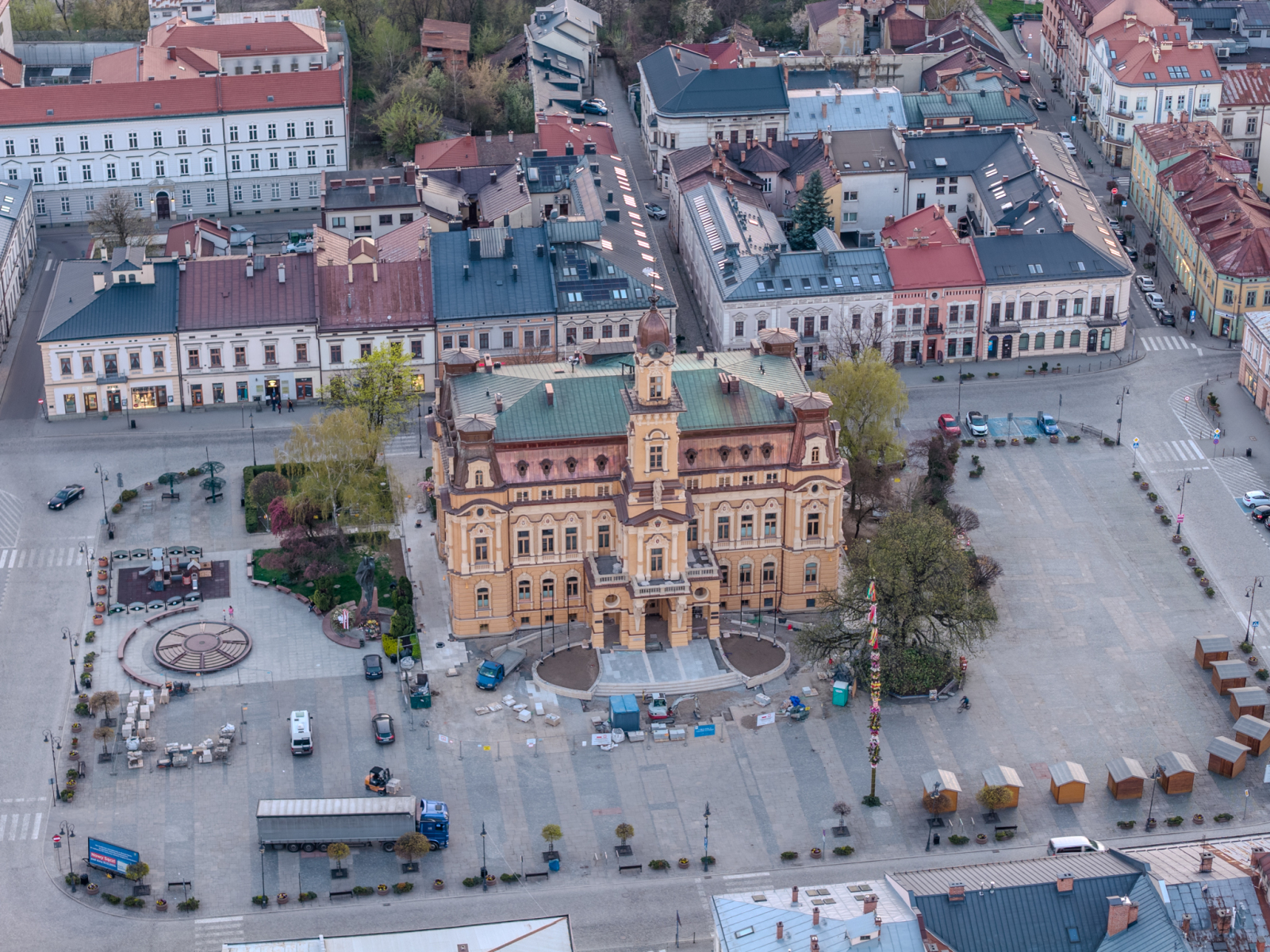 Dla fotografii z drona to idealne warunki. Z jednej strony można pokazać skalę miasta, z drugiej wyciągnąć detale: układ rynku, linię ulicy Lwowskiej, bryłę ratusza czy meandrujący przebieg rzeki Kamienicy. Takie ujęcia dobrze oddają zarówno charakter miejsca, jak i jego codzienne życie.